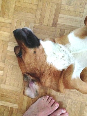 Erwähnte ich schon, dass Sam ein großer Hund ist? Stellen Sie sich alle großen Hunderassen vor, kreuzen Sie diese und stecken sie ein Pony dazu. Dann haben Sie ein ungefähre Vorstellung. Hier sind meine Füße (Schuhgröße 40/41) neben seiner Nase.
