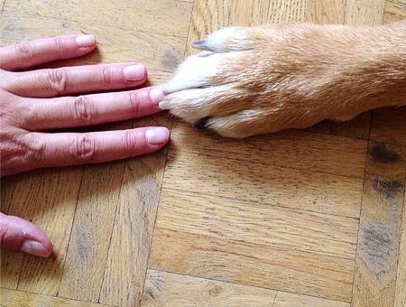 Dies ist mein Tagesaufhellerbild für heute. Diese riesige Hundepranke mit meinem nicht gerade feingliedrigen Händchen.