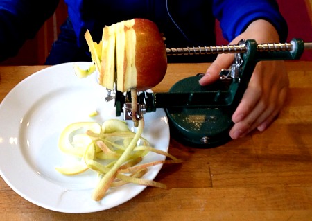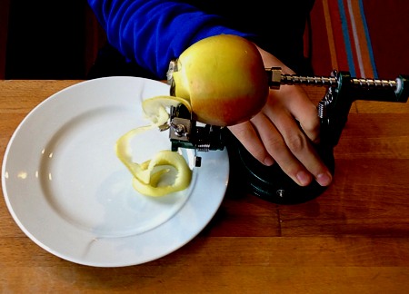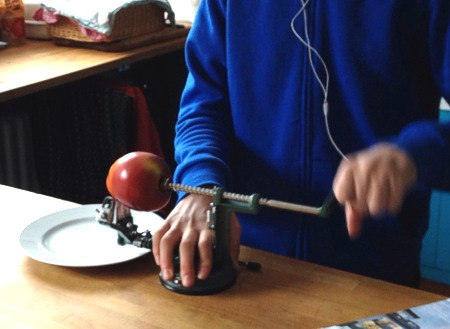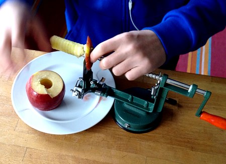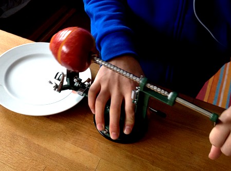 Letztes Jahr trat die Apfelschälmaschine (x-beliebiger Beispiel-Link, die gibt´s auch preisgünstiger) in unsere Leben; Herr Skizzenblog hatte die Notwendigkeit von technischer Unterstützung der überarbeitetenden Hausfrau erkannt und schenkend gehandelt.