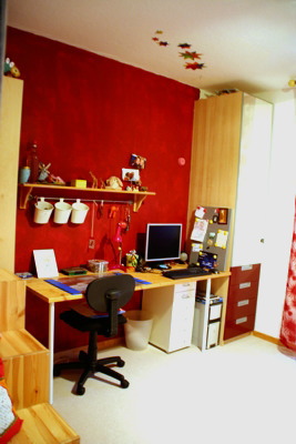 Der gekürzte Schreibtisch neben dem Kleiderschrank, mit Sternen an der Decke :-)