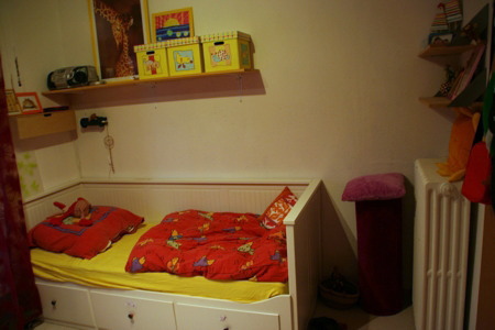 In die Lücke zwischen Bett und Heizung an die Wand kommt noch ein 40cm breiter Billy für die vielen Bücher, die derzeit noch in drei Umzugskisten liegen. Gestrichen wurden die hellen Wände, denn die waren vorher hellgrau-dreckig, jetzt sind sie hellbeige-fleckig. Der Teppich ist angeblich pflegeleicht, das Töchterlein wünscht sich zu Weihnachten noch einen roten Zottelteppich, der angeblich auch pflegeleicht ist. Wir werden sehen.