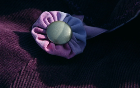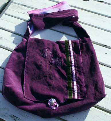 Das ist eine große pompadura (schluckt leicht Din A4) aus weichem Babycord in dunklem Violett. Die Tasche hat vier Innentaschen und eine bestickte/mit Bändern verzierte Klappe. Sie wird geschlossen mit einem Knopf: