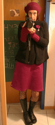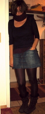 Schnell mit dem jüngsten Kind zum Schwimmen, bzw. das jüngste Kind dort abgeliefert und einkaufen gewesen. Bevorzugtes Herbst/Winter-Outfit: Rock, Stiefel, dicke Strickjacke. Und ne Kappe auf dem Kopf.