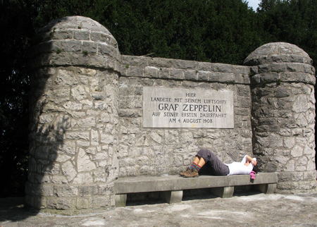 Auf dem Weg nach Mainz gab es eine Panne und Graf Zeppelin musste notlanden. Das Denkmal wurde für alle hilfsbereiten Bauern gesetzt, die ihre Felder im Stich ließen und zu Hilfe eilten, so dass der Zeppelin am Abend noch weiterfliegen konnte.