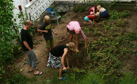 Vier Erwachsene und vier Kinder buddelten in der Erde herum …