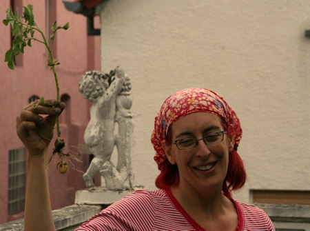 Ganz im Hintergrund links ein rosa Haus, das von vorne aber dunkelrot ist, davor ein Puttenengel, der aber festbetoniert ist und sich nicht von unserer Mauer lösen lässt und im Vordergrund Frau … äh … Mutti, die eine mickrige Kartoffelpflanze samt mickriger Knolle in die Luft hält. Es ist eines dieser Bilder, die man eben macht, obwohl man nicht weiß warum und weswegen man sie jemals jemanden zeigen sollte. Und genau deshalb zeige ich es Ihnen, weil ich ein wundervolles, sehr arbeitsintensives, Wochenende hatte und deswegen einfach gut drauf bin.