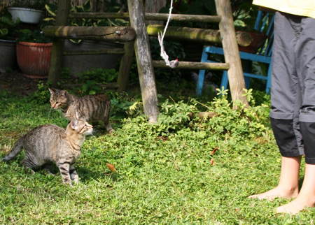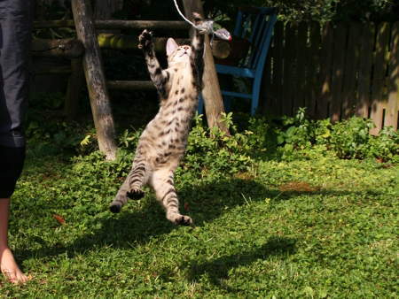 Eine Gerte vom Flieder durch´s Gras gewischt und die Katerlinge sind glücklich. Manchmal fangen sie auch die Zehen, aber sie haben ja noch so niedliche, kleine Milchzähne.