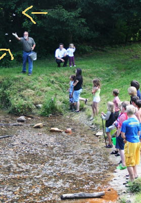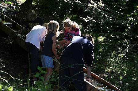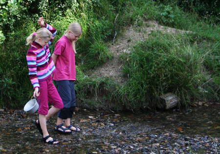 Jeden Morgen, pünktlich um 10:15 Uhr, erschien der Besitzer des Campingplatzes mit seinem zerbeulten Blecheimer am Bach und begrüßte die wartenden Kinder mit einem schallenden „Guten Morgen!“ „Guten Morgen!“ tönte es zurück und die Fragen „Wollt ihr große Steine, bunte Steine, VIELE Steine?“ wurden stets mit einem jubelnden „JAA!“ beantwortet. Es hieß „Einen großen Schritt zurück!“ und dann landeten die Steine im Bach: