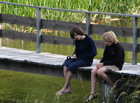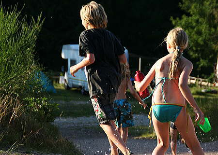 … der Erholungswert war enorm, sechs Kindelein von acht bis 13 Jahren sind begeistert und schwärmen, genau zweimal musste ich mahnend die Stimmer erheben, nur dreimal flossen Tränen und das Gewitter kam, als wir abgereist waren. Die Sache mit der Verpflegung ging relativ leicht, da wir jeden Morgen zwei Brötchen pro Nase bestellt hatten. Dazu gab es Müsli aus den heimischen Vorräten, Butter, Nutella, Marmelade, Käse aus der Kühlbox. (die Kühlakkus konnten im Gefrierschrank am Platz wieder gefrostet werden, sehr praktisch). Mittags irgendwann gab es eine gesunde Zwischenmahlzeit, die in erster Linie aus Keksen bestand. Mit ein paar Äpfeln. An einem Abend kochte ich ein vollwertiges Essen: Nudeln mit Tomatensoße. Eine ziemlich spannende Geschichte, da ich lediglich zwei Trangia-Kocher zur Verfügung hatte. Am ersten Abend grillten wir, einmal gingen wir ins Restaurant und das beste Essen gab es, als ich die riesige Tupperschüssel im Restaurant mit Pommes füllen ließ. Einmal Eis essen gehen am Tag war Pflicht und dass es am letzten Tag mittags Butterkekse mit Brotbeisserwürstchen gab, verziehen die Kindelein gerne. Immerhin waren die Vorräte für vier Tage berechnet. Konnte ja keiner ahnen, dass wir spontan einen Tag verlängern würden.
