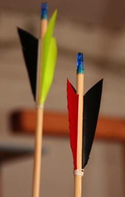 Hier einige Arbeitesschritte beim Bauen der Pfeile: Federn zuschneiden, ankleben, fertige Pfeile wickeln: