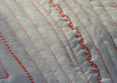 Mein Nähmaschinen hat einige Quiltstiche. Die musste ich natürlich ausprobieren :-) So sieht´s von unten aus und so von oben, an seinem künftigen Platz: