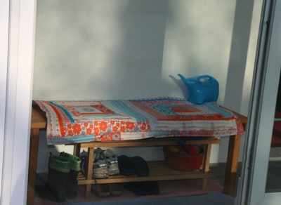 Im Vorräumchen zur Terrasse, auf der Bank. Jetzt fehlen „nur noch“ ein etwas größeres Deckendingsbums als Wandbehang zum Anlehnen und die drei Kissen, die sonst auf dieser Bank liegen, müssen passend angezogen werden.