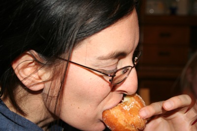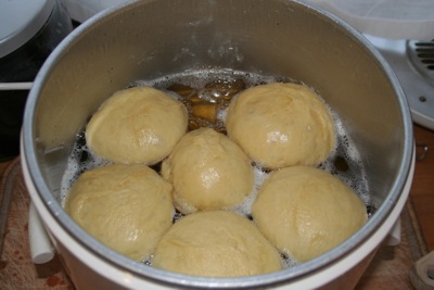 Ganz heiß aus der Friteuse, mit Marmelade gefüllt und Puderzucker bestäubt. Morgen früh dann direkt auf den Hüften, aber unglaublich lecker. Hier heißen sie Kreppel, aber ich glaube, in anderen Regionen heißen sie Krapfen.