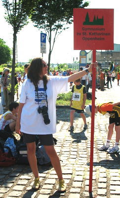 Es blieb nur wenig Zeit zum Ruhen, denn der weite Weg zurück zum vereinbarten Treffpunkt lag noch vor den Läufern der vierten Staffel und den Helfern. Diesmal nicht am Rhein entlang, denn die Laufstrecke konnte wegen der vielen Läufer nicht mehr gequert werden. Also an der Laufstrecke entlang, keuchende Marthonläufer anfeuernd, müde Staffelläufer ermunternd und dabei immer schön das rote Schild hochhalten, damit niemand verloren geht.