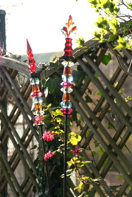 Mein Garten wäre nicht mein Garten, wenn nicht das eine oder andere etwas kitschige Teil darin zu finden wäre. Zwischen den Glockenblumen sitzt ein Froschkönig, am Zaun, ganz neu gekauft, diese beiden: