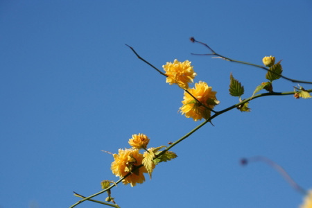 Neben der Bank blüht gerade der Ranunkelbusch: