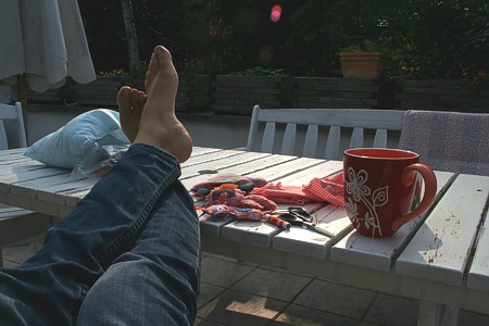 Das Beinchen kann ich auch prima auf der Terrasse hochlegen und die Kindelein versorgen mich mit Tee und Kaffee.