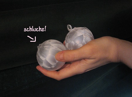 Beim Abschmücken des Baumes passierte es dann: eine meiner heißgeliebten Lauschaer Eiskugeln fiel zu Boden und der aus Glas gezogene Aufhänger brach ab. Bleibt für das nächste Weihnachten nur der Ostereier-Aufhängtrickt: Streichholz durchbrechen, Fädchen drum, in die Kugel friemeln und freuen, dass der Schaden doch recht klein ist.