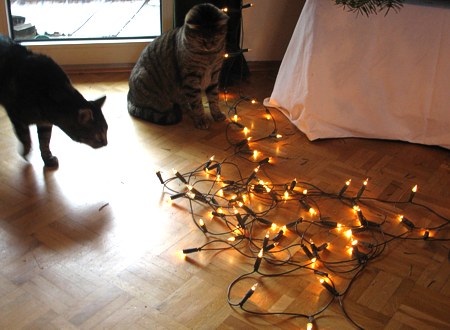 Die Katertiere halfen eifrig mit, damit ich auch beim nächsten Weihnachtsbaum schmücken vorher viel Spaß beim Entwirren der Lichterkette habe. So niedliche Tiere.