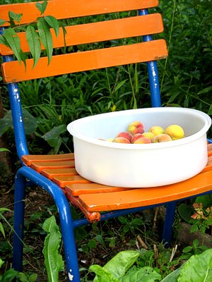 Stuhlleben mit Pfirsichen in überteuertem Plastik :)