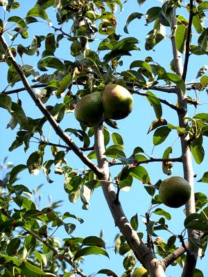 Viele kleine Birnen am Baum. Und ein Pilz auf den Blättern. Demnächst müssen wir Herbst spielen und die verpilzten Blätter abpflücken.