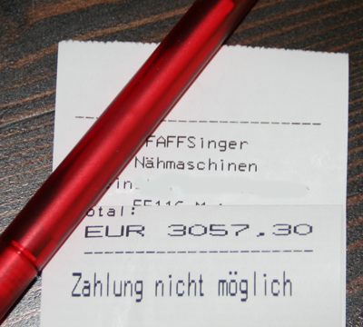 Eine ist kaputt, weil sie keinen Unterfaden mehr nach oben transportiert und auch ansonsten irgendwie klemmt. („Haten wir noch nie“, sagt der freundliche Händler und sucht eine Adresse, an die die Maschine zur Reparatur geschickt werden darf.)