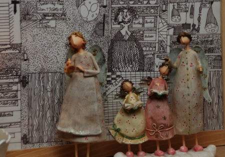 Die vier Engel, die jedes Jahr einmal aus der Kiste dürfen. Dieses Jahr dürfen sie vor dem Bild des großen Kindes vor sich hinglitzern. (die Verkäuferin hinterm Ladentresen scheint´s zu freuen)