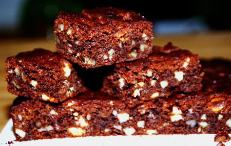 200g sportliche Ritterschokolade in sehr grün, 100g Pecannüsse zerbröselt, 100g weiße No-Name-Schokolade gehackt. Der Rest genauso, wie Frau Barcomi es im roten Backbuch schreibt. Bis auf die Tatsache, dass der Ofen nicht zu Beginn des Backens vorgeheizt werden sollte, da die geschmolzene Butter/Schoko/Zucker-Mischung abkühlen soll. Zwei Stunden Ofen heizen macht zwar mollig warm, ist ansonsten aber eher dämlich.
