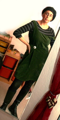 (zum Kleid trägt die olle Mutti ein olles StreifenShirt, schwarze Overknees und die ganz alten Stiefel. Und das neue Mützchen. Und fühlt sich sauwohl so.)