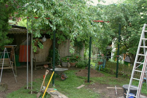 Der beste Vater meiner Kinder betoniert gerade die beiden Kletterstangen ein. Die Schaukel, bzw. das ganze Gerüst ist toll. Aber riesig, drei Meter hoch. Plötzlich wirkt der obere Teil des Gartens deutlich kleiner.