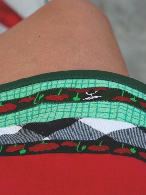 Die Naht, die man außen am Rock sieht, also oben, wo der Unterrock angenäht ist (meine Güte, aber wie soll ich das beschreiben?), ist unter dem Mohnblütenband versteckt, der Unterrock bekam auch noch ein bißchen Mohnthema.