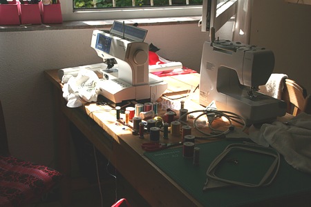 Noch zwei Stunden. Chaos. Nadelbruch. Unterfadenschlingereien. Weiß nicht, welche Farbe zu welcher Farbe passt. Zu viele Farben im Haus. Wilde Flüche. Kinder zu den Großeltern geflüchtet. Kein Kaffee mehr in der Kanne. Nur noch eins. Keine Lust mehr. Mist.