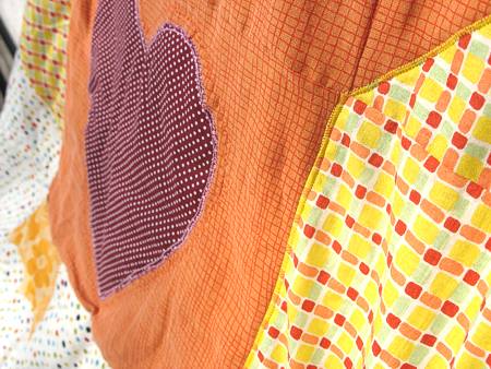Erfolgreich. Sehr alte Stoffe (Bettwäsche meiner Eltern), ein alter Vorhang (von der Frau aus Bad Münster), orangefarbene Bettwäsche (seit zwei Jahren ausgemustert), ein Kopfkissen vom Flohmarkt, irgendwelche Reste aus der Kiste und der Pünktchenstoff aus dem blaugelben Möbelhaus. Dazu zwei Nadeln und ungefähr drei Kilometer Garn.