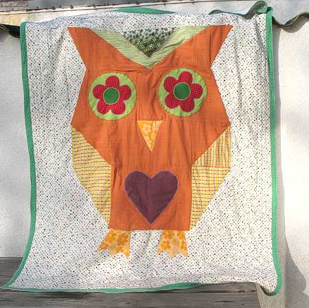 Sie runzelt etwas die Stirn und ist um die Augen nicht ganz faltenfrei. Doch damit passt sie ja ganz gut zu mir, meine allererste Eulenpatchworkdecke.