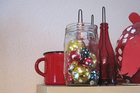 Mit weißem Lackstift habe ich Pünktchen darauf gemalt und jetzt warten sie im alten Gurkenglas oben auf dem Schrank, bis ich sie in zwei Wochen oder so zu Dekozwecken in der Wohnung verteile. Zusammen mit vielen weiteren gepunkteten Kugeln in vielen Farben. Weihnachten wird bunt.