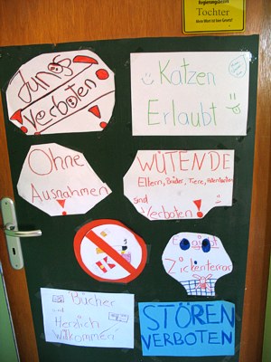 Der „Türschmuck“ ist knapp zwei Jahre alt und ja, wir hatten kurz vor dem Malen der Schilder eine kleine Meinungsverschiedenheit. Woher Tochter das Wort „Zickenterror“ hat, weiß ich nicht, denn es ist nicht in unserem aktiven Wortschatz, genau genommen mag ich die Bezeichnung „Zicke“ für Mädchen nicht sonderlich. Nun denn.