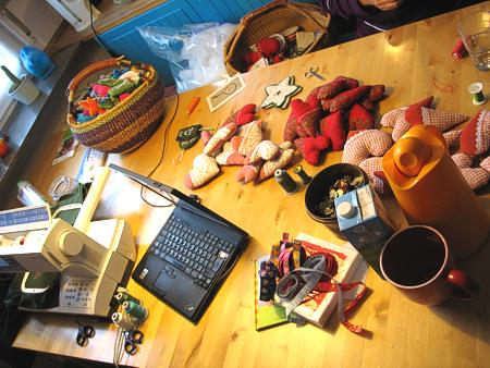 Oma Eis, die Stickmaschine, der Rechner, viel Kaffee, viel Stoff, viel Garn, viele wunderbare Bänder aus Rieger´scher Feder (Danke!!), viele Knöpfe, Herzen, Sterne und obendrüber eine Menge Lavendelduft.