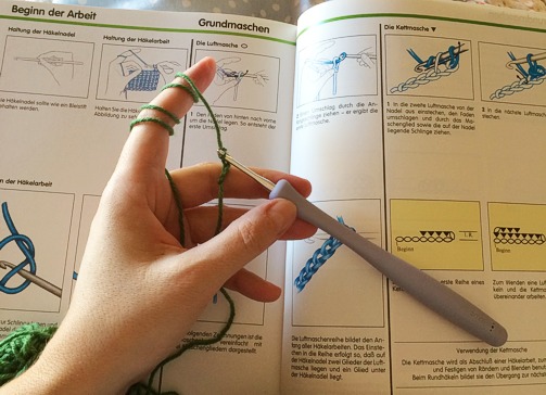 Häkeln habe ich schon einmal gelernt, damals in der Grundschule. Vage hatte ich irgendetwas mit Stäbchen im Hinterkopf, aber leider ist es beim Häkeln nicht so wie beim Radfahren: man das total verlernen. Wobei ich nicht ausschließen will, dass ich das verlernen wollte, weil das Häkeln in der Grundschule eine echte Qual war. Mühsam hatte ich einen roten Topflappen gehäkelt, nicht quadratisch, sondern eher trapezförmig, aber immerhin ein Lappen. Beim Umhäkeln mit Mausezähnchen hatte ich tatsächlich Spaß, das ging mir erstaunlich leicht von der Hand. Vielleicht mochte ich auch die gelbe Wolle sehr. Auf den Topflappen bekam ich einen Gnaden-Vier. Zum einen, weil ich nur einen Topflappen und kein Paar gehäkelte hatte und zum anderen, weil die Mausezähnchen sicher fremd-gehäkelt waren. Dieses Gefühl der Machtlosigkeit, weil die Handarbeitslehrerin mir einfach nicht glauben wollte, kann ich noch immer spüren. Doofe Nuss, diese Lehrerin.