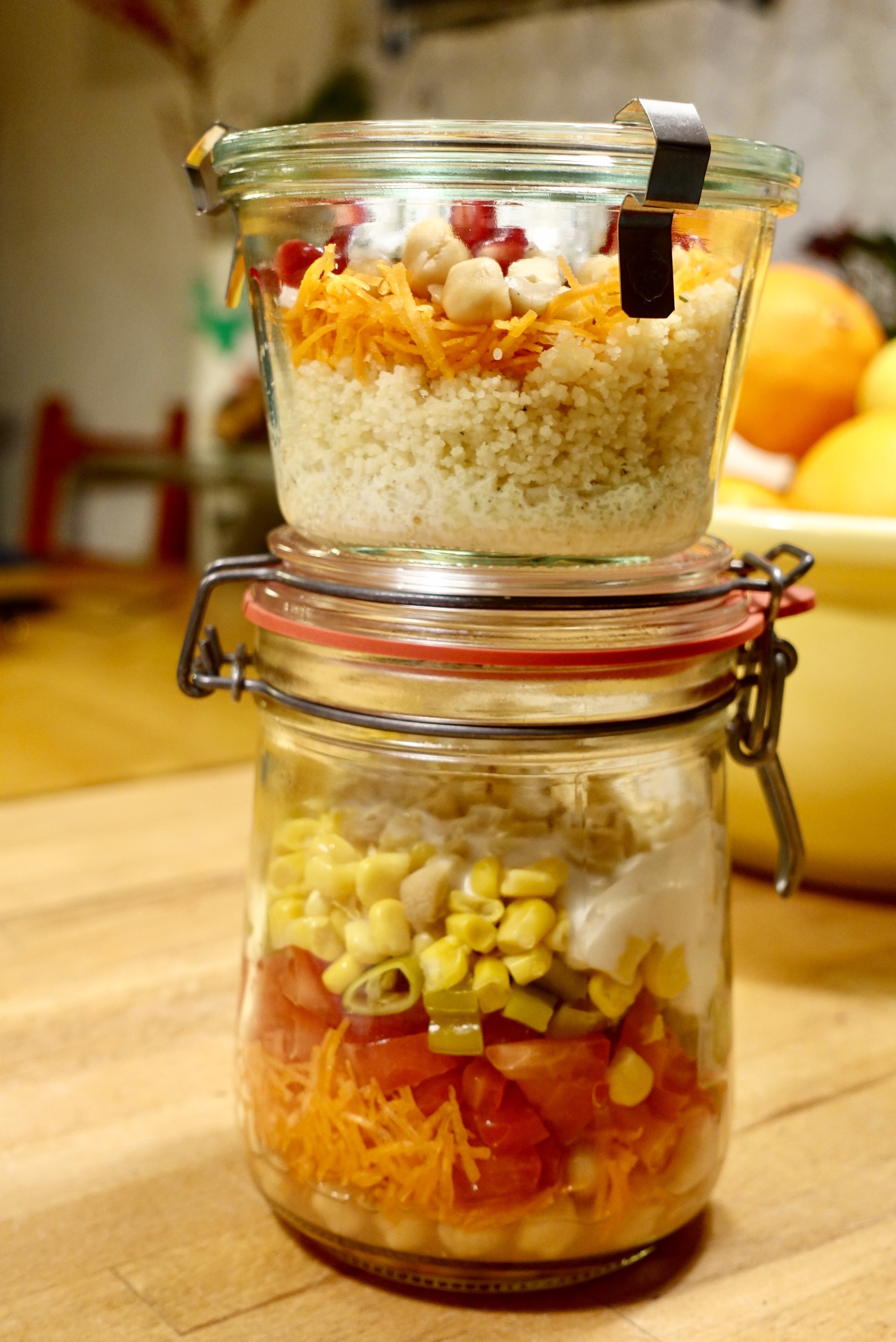 Total hipstermäßig habe ich mir einige Gläser mit Salatzeugs gerichtet. Schon bei den Vorbereitungen fühlte ich mich wahnsinnig gesund und achtsam, beinahe hätte ich noch ein paar Yogaübungen gemacht oder wenigstens ein Mandala ausgemalt.