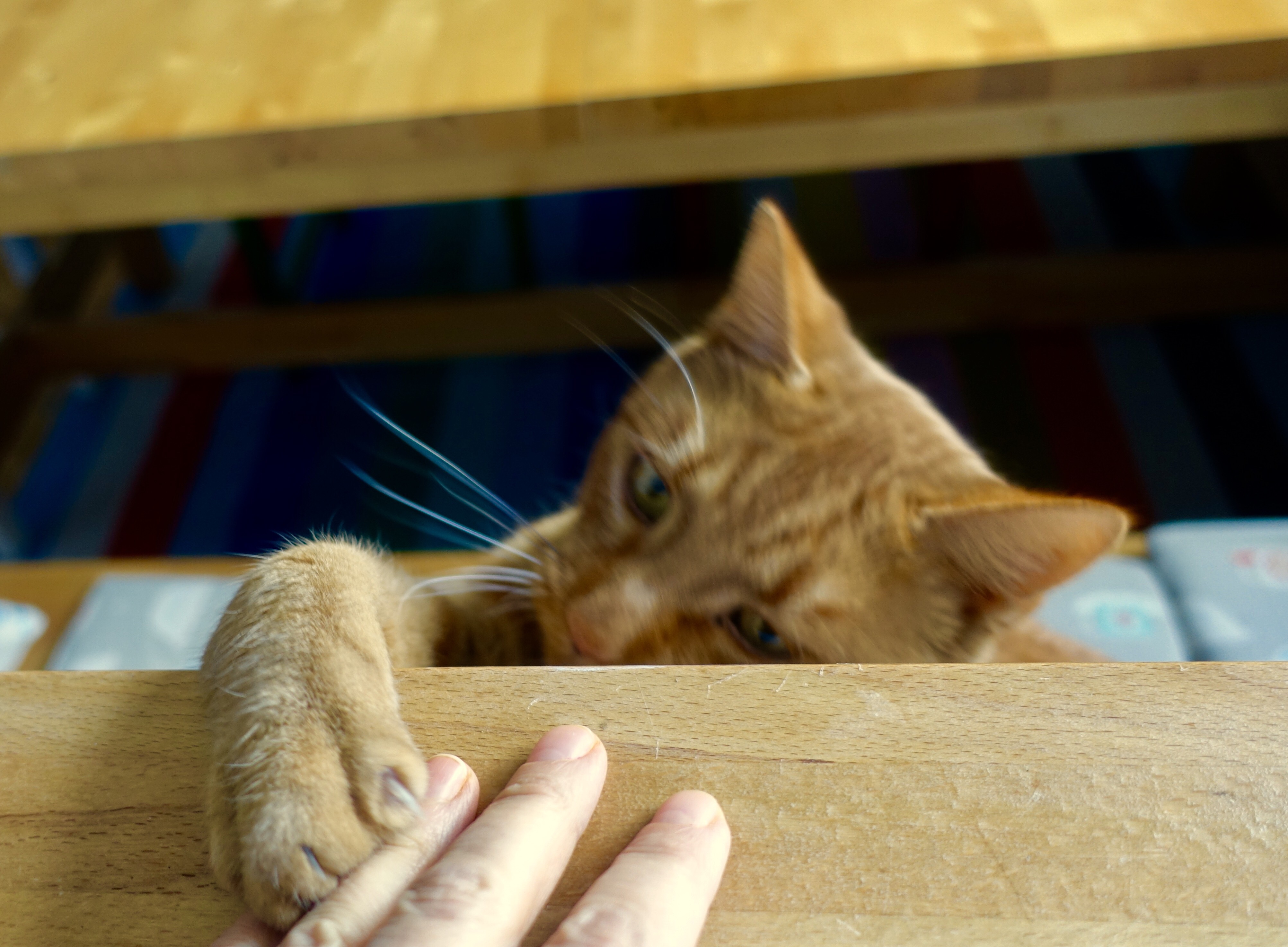 Als nach der doofen Putzerei in der Küche wieder Ruhe einkehrte, sprang Franz auf die Küchenbank, um dort sein drittes Vormittagsschläfchen zu halten. Da er sehr niedlich aussah, beschloss ich, noch ein bißchen mit der neuen Knippse zu üben, doch: