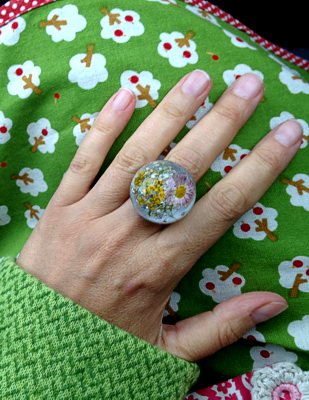 Und als ich meinen Blick weiter schweifen ließ, entdeckte ich die Ringe. Ringe mag ich genauso wie Buttons, habe aber leider eine geringere Auswahl davon. Zarte Blüten eingegossen in Gießharz. Vergissmeinnicht hatte ich am Finger, Feinstrahlastern und Schleifenblümchen. Hornveilchen gab´s und Gänseblümchen. Am Leichtesten wäre es gewesen, wenn ich einfach alle genommen hätte. Ich habe Ihnen aber ein paar übrig gelassen, die können Sie in diesem Dawandashop kaufen.